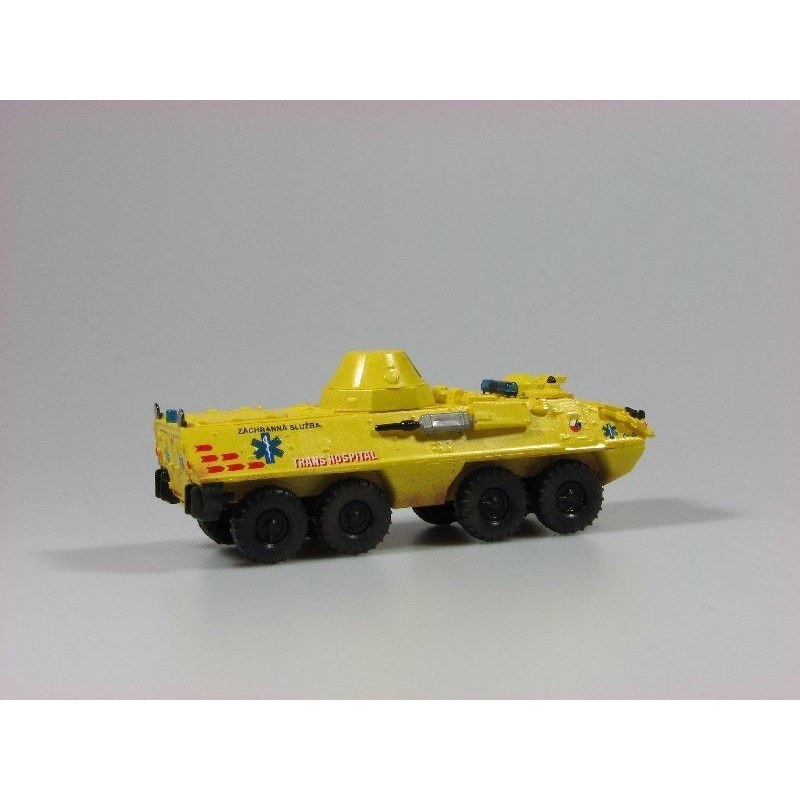 Kompletní plastiková stavebnice obrněného transportéru – Záchranná služba Transhospital. Obsahuje probarvené plastikové výlisky na sestavení modelu, leptané doplňky, kovové osičky a sadu obtisků.