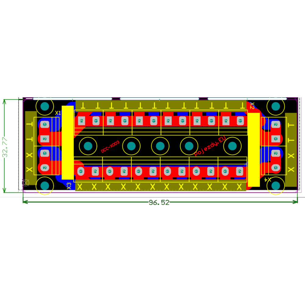 Neosazená deska pro rozvod signálu a napájení pod kolejištěm. Lze pájet přímo vodiče a nebo osadit svorkovnici s roztečí 5 mm a v barvě / provedení dle výběru.