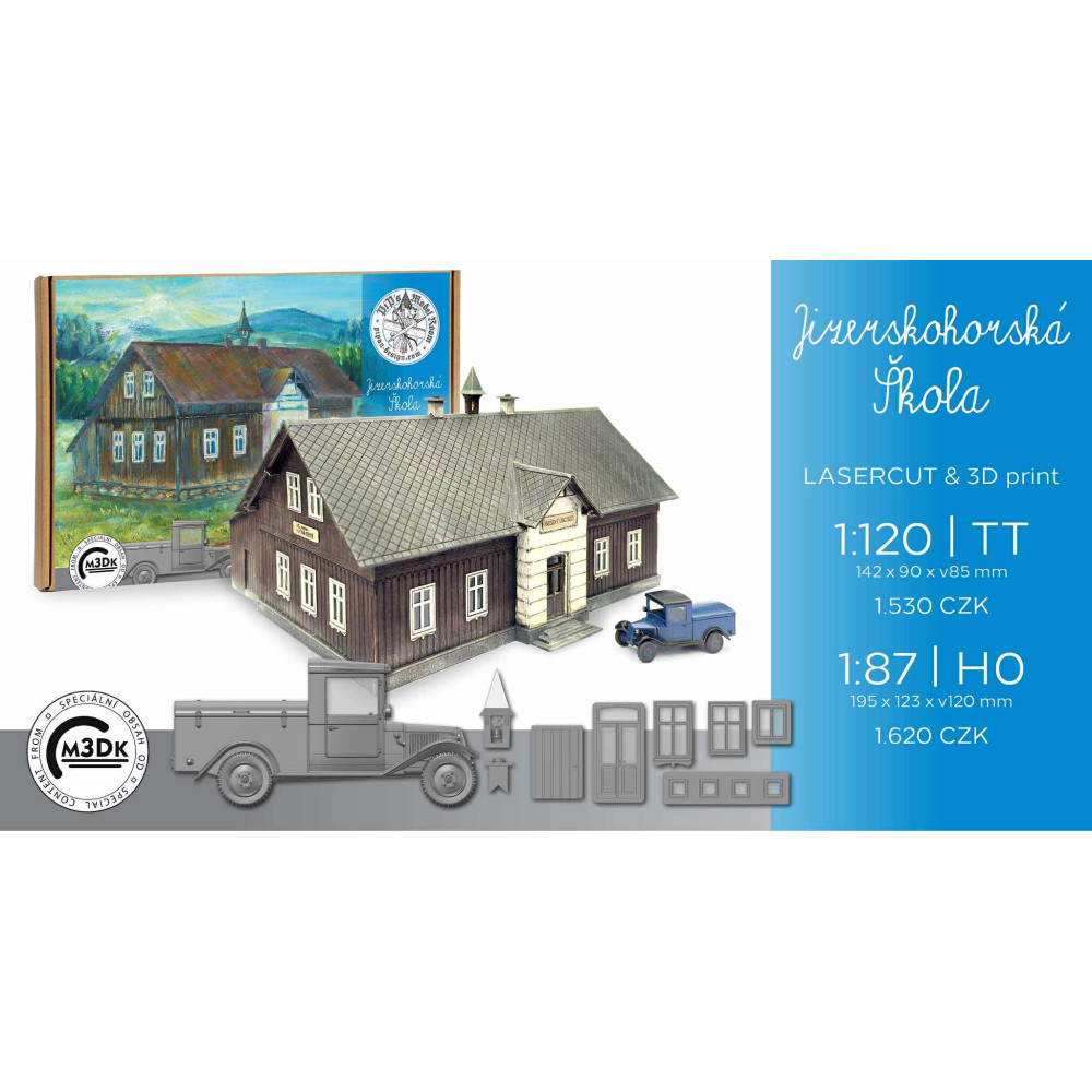 Exkluzivní stavebnice budovy Jizerskohorské školy - omezená série 20 ks. Kombinace laser cut, 3D tisku a leptů. Rozměr 142 x 85 x v90 mm.