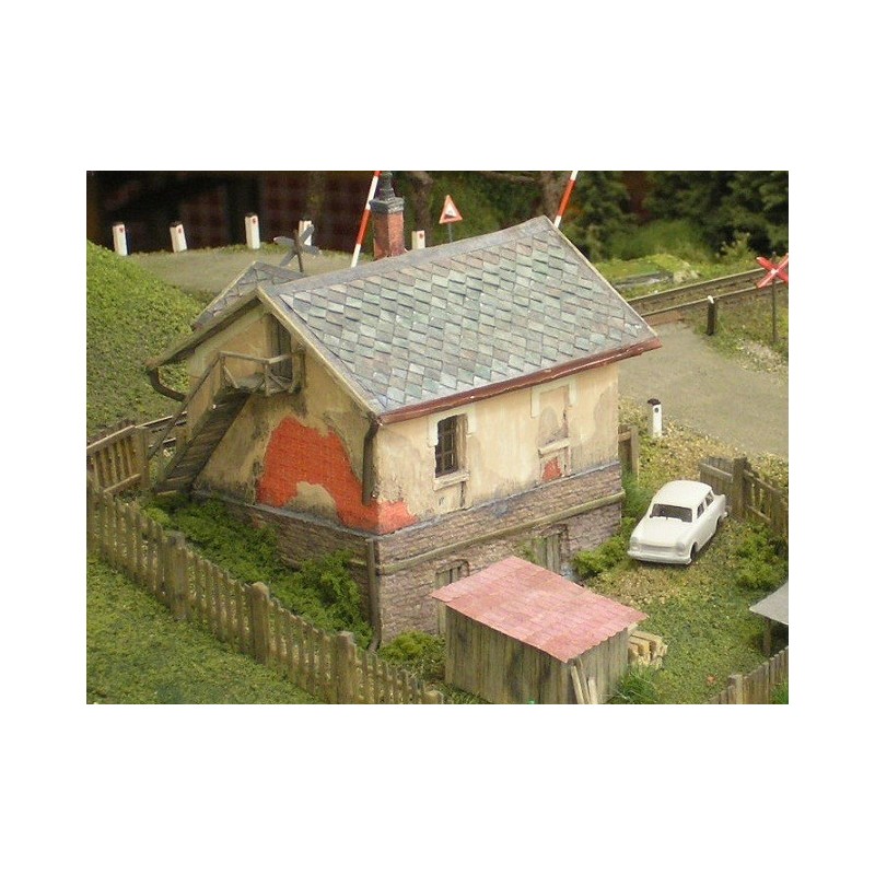 A semi-kit house made using laser cut technology. The Moravian-Silesian Northern Railway (MSNB) guard house from Brno via Nezamyslice and Olomouc to Šternberk, belonging to KFNB and opened in 1869-1870. This guard house was built in two versions, one of which we offer for construction. Where the terrain did not allow the house to be built directly on flat ground, it was built on an artificially created embankment so that the cellars could be accessed from the outside. These guard houses were then also built on other KFNB lines. With the introduction of ticket sales, they served as station buildings when stops were established, and after the construction of waiting rooms with ticket offices, they continued to serve as guard houses. Design: Smooth plaster walls in gray ochre, gray foundation. Windows in shallow recesses open outwards, doors open inwards. Windows and doors are brown. The roof is covered with slate in the Czech style, later with asbestos cement after repairs. The chimney is unplastered.