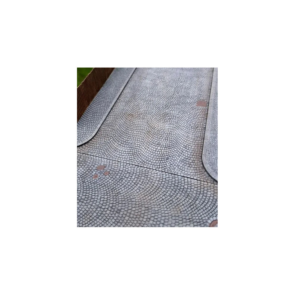 Laser-cut T-shaped cardboard intersection with a surface made of small cubes stacked in a so-called ring binding, designed for modular roads and sidewalks Model Scene in TT size. Part of a system with connection to corner sidewalk pieces.