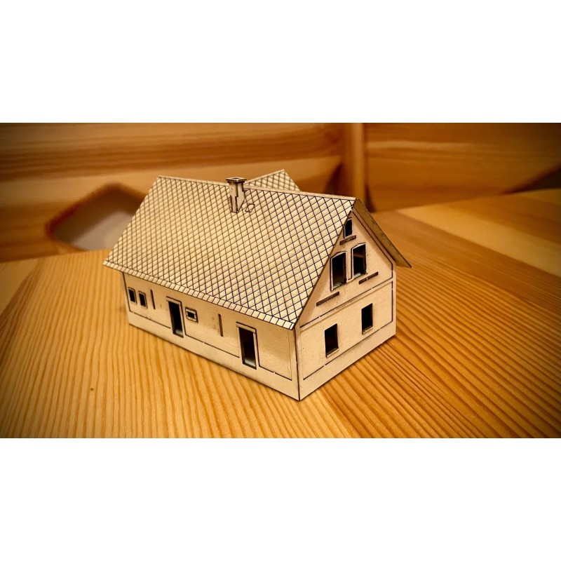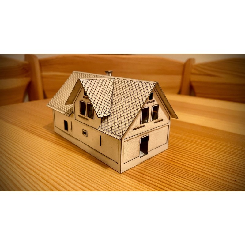 Exclusive family house construction kit – limited series of 30 pieces. Combination of laser cutting, 3D printing, and etching. Dimensions: 120 x 67 x 71 mm.